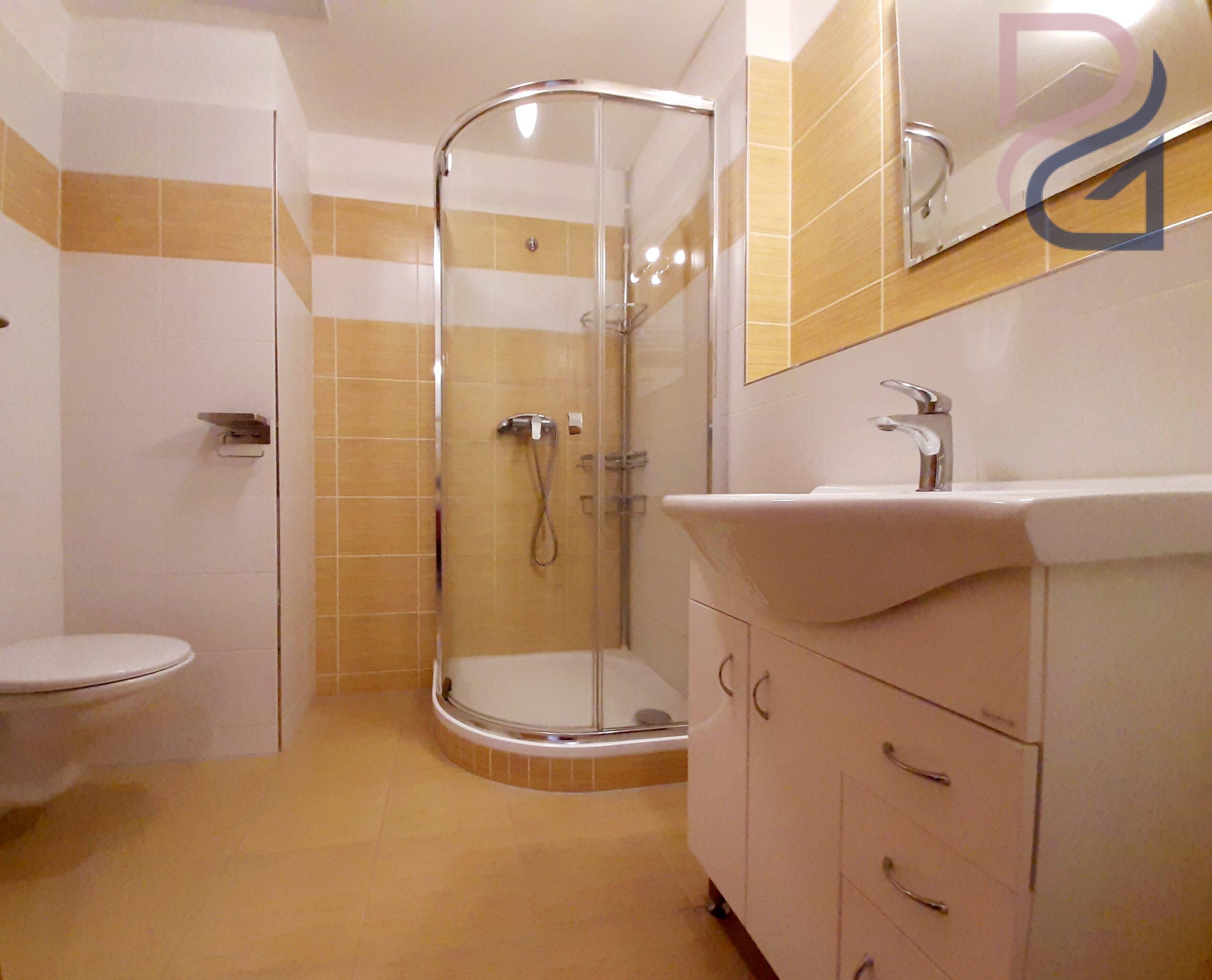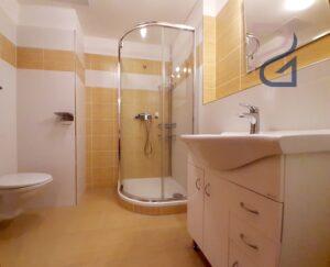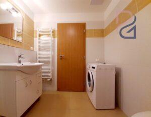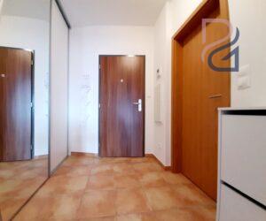 Dále je zde předsíň s velkou vestavnou skříní a botníkem a koupelna se sprchovým koutem, WC a přípojkou na pračku. K dispozici je také komora o velikosti 2 m2, umístěná v přízemí domu, možnost připojení na TV anténu a internet a společná oplocená zahrada u domu.