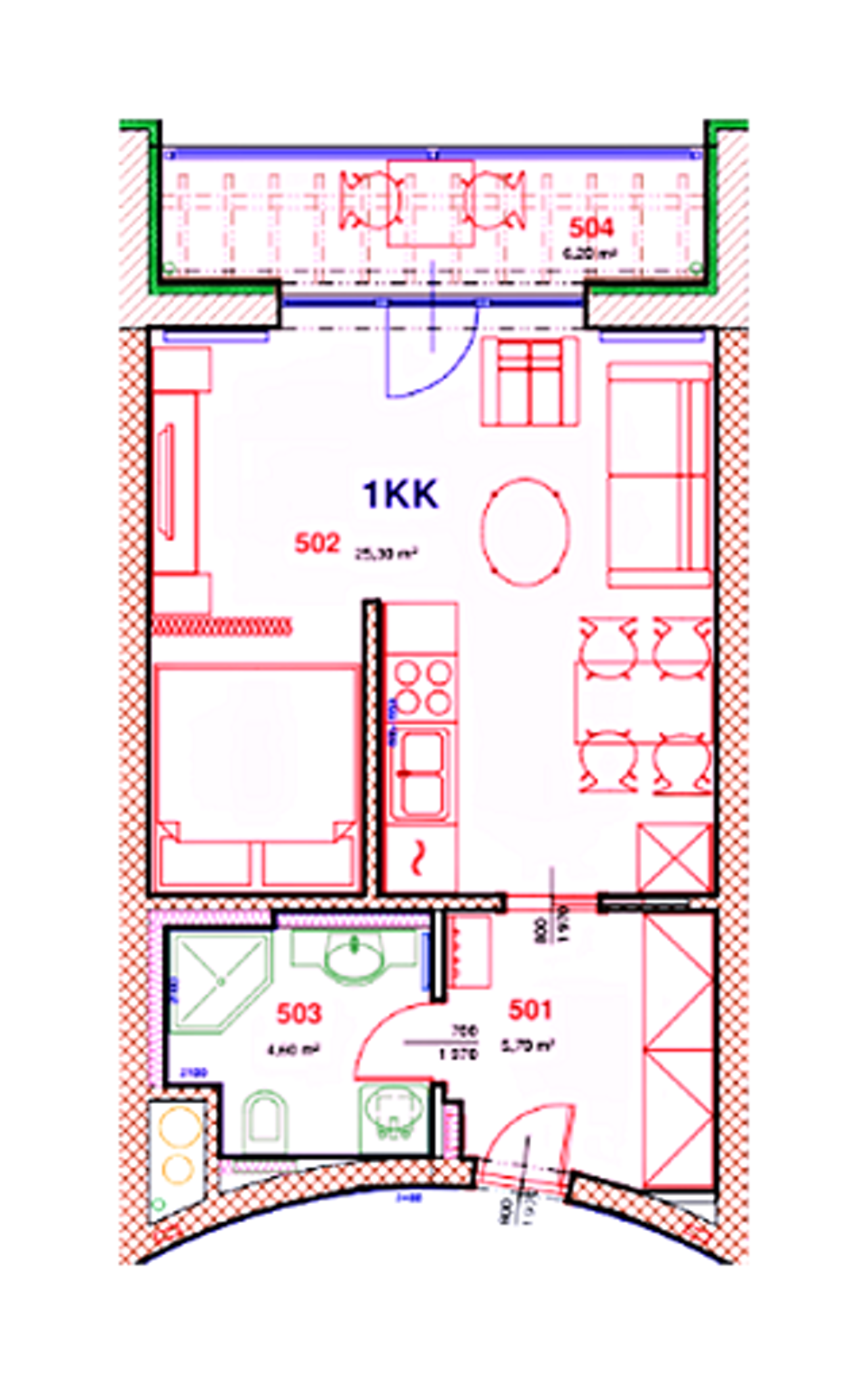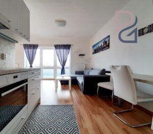 Bytová jednotka o výměře 37 m2 je situovaná ve čtvrtém nadzemním podlaží bytového domu s výtahem. Sestává z prostorného pokoje s kuchyňským koutem, který je vybaven moderní kuchyňskou linkou s vestavnými spotřebiči - myčkou, elektrickou multifunkční troubou, sklokeramickou varnou deskou, digestoří a lednicí s mrazničkou.